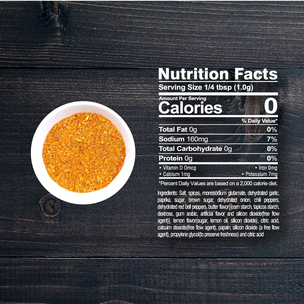 Salt, kryddor, mononatriumglutamat, torkad vitlök, paprika, socker, farinsocker, lök, chilipeppar, uttorkad röd paprika, citronsmak (socker, citronolja), surhetsreglerande medel (citronsyra, E330), papaya, emulgeringsmedel (propylenglykolalginat, E405), smörarom, klumpförebyggande medel (kiseldioxid, E551).