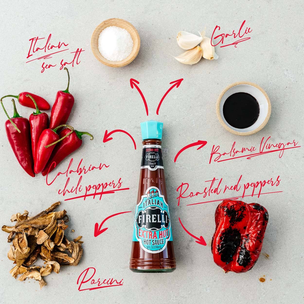 Roasted red peppers (origin Spain), water, Aceto Balsamico Di Moden IGP 12% (wine vinegar, concentrated grape must), apple vinegar, Calabrian chili peppers 6%, concentrated lemon juice, sugar, natural flavors, salt, spices, dried Porcini mushrooms, thickener (xanthan gum).