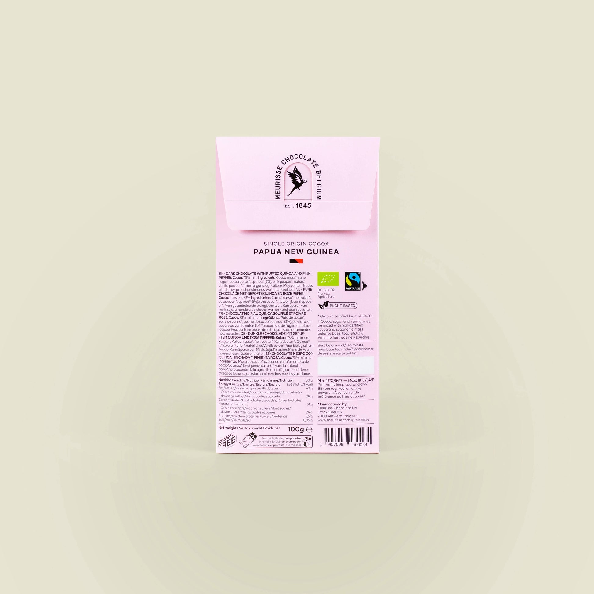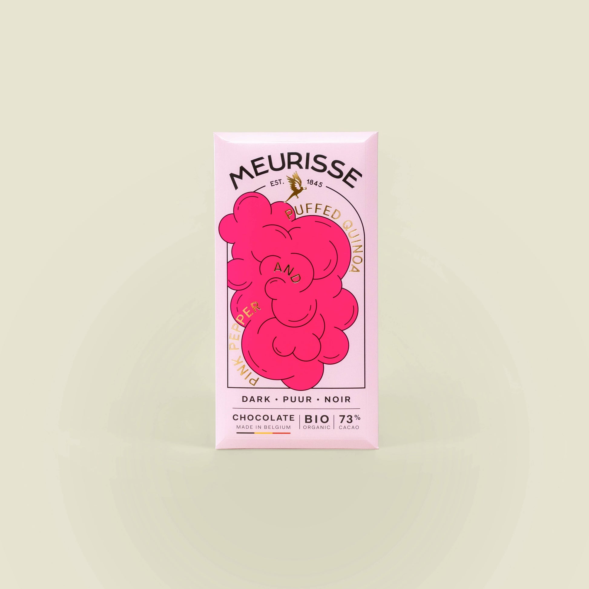 Styrkan i vÄr mörka choklad med krispigheten i den puffade quinoa Àr himmelsk och kittlar oss med sitt blommiga peppriga temperament av rosa peppar.