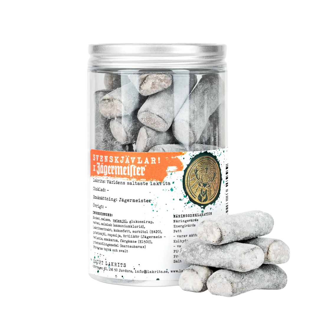 Svenskjävlar! smaksatt med Jägermeister tar gottegrisen på en intensiv smakresa. Haupt lakrits salta lakrits möter Jägermeisters komplexa örtsötma och kryddighet.