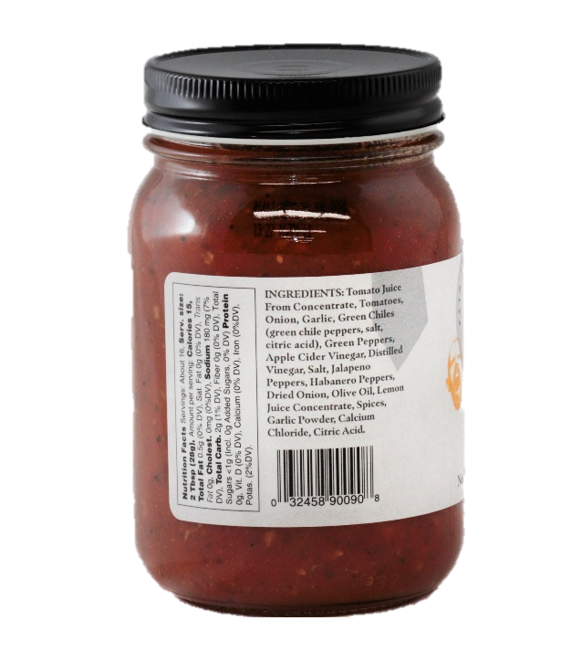 Ingredienser: tomatjuice frÄn koncentrat, tomater, lök, vitlök, gröna chili (gröna chili, salt, citronsyra), gröna paprikor, ÀppelcidervinÀger, destillerad vinÀger, salt, jalapeño, habanero, torkad lök, olivolja, citronsaft frÄn koncentrat, kryddor, vitlökspulver, kalciumklorid, citronsyra.