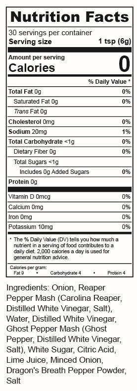 Lök, Carolina Reaper-chilipurĂ© (Carolina Reaper-chili, destillerad vitvinsvinĂ€ger, salt), vatten, destillerad vitvinsvinĂ€ger, Ghost Pepper-chilipurĂ© (Bhut Jolokia-chili, destillerad vitvinsvinĂ€ger, salt), vitt socker, surhetsreglerande medel: citronsyra, limejuice, finhackad lök, Dragonâs Breath-chilipulver, salt.