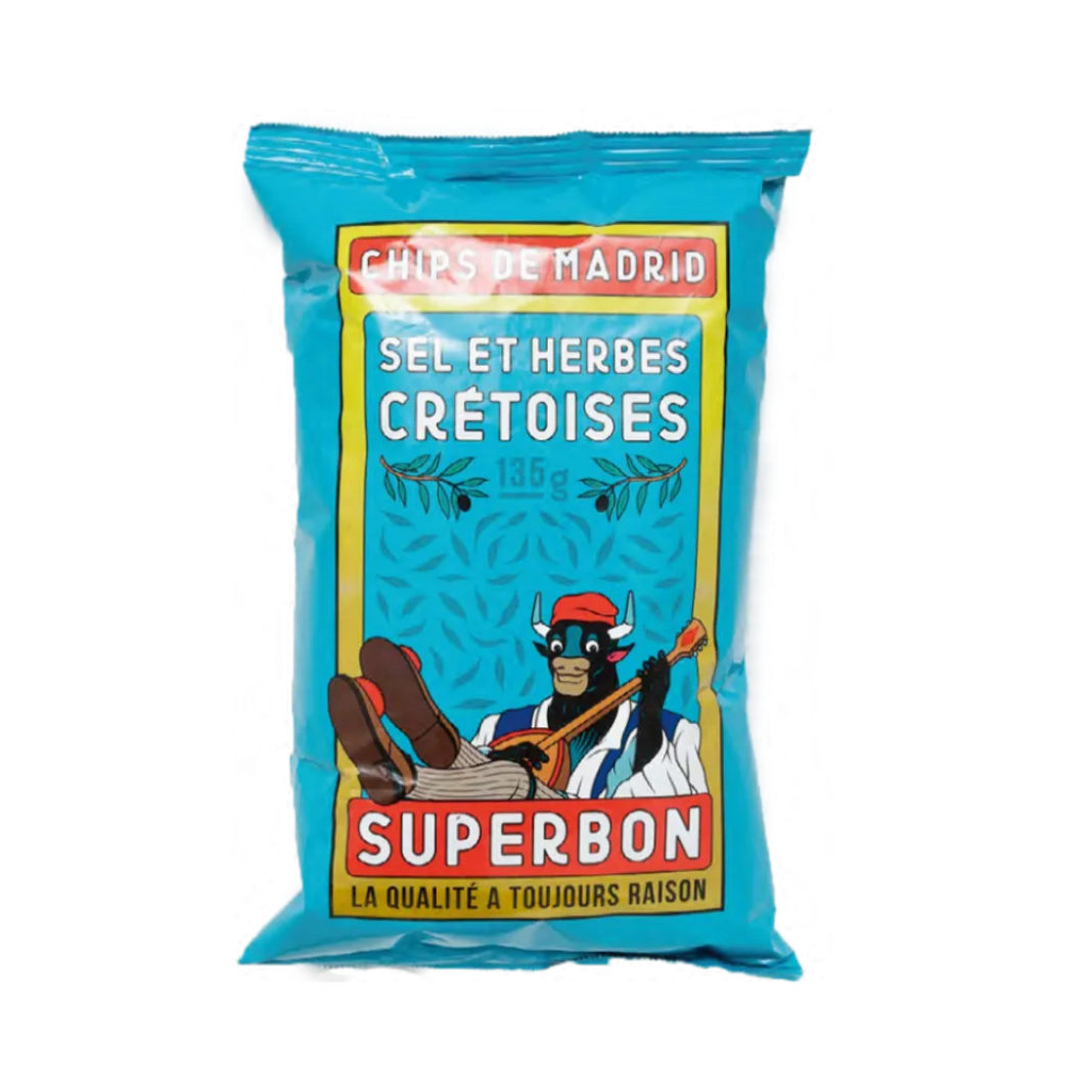 Krispiga potatischips kryddade med en mix av kretensiska örter: kyndel, timjan, rosmarin, saffran, peppar, ingefÀra, koriander, fÀnkÄl, dill, mynta, oregano, linfrö och havssaltsflingor.