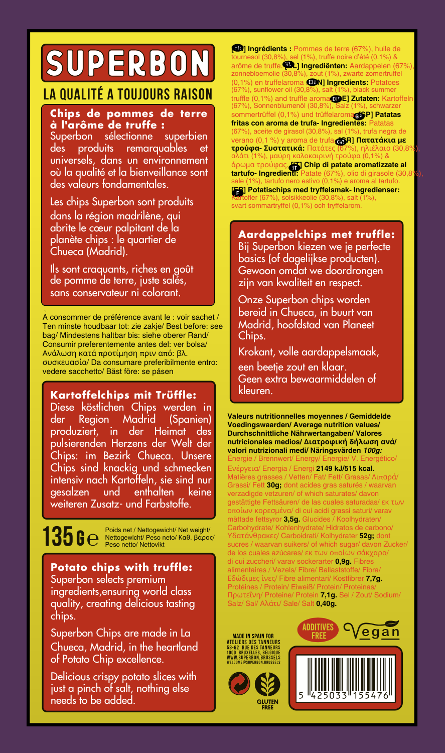 Potatis (65,8%), solrosolja (28,2%), tryffelarom, salt (1%) svart sommartryffel (0,4%).